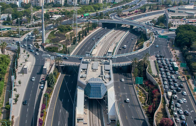 The Wolfson train station extends over an area of 2100 sqm., interwoven with aluminum and glass, situated in the Wolfson ring that functions as a meeting point for the three cities, Tel Aviv, Bat Yam and Holon. Its futuristic shape, a sort of airplane taking off, embodies the future, motion, speed and efficiency.