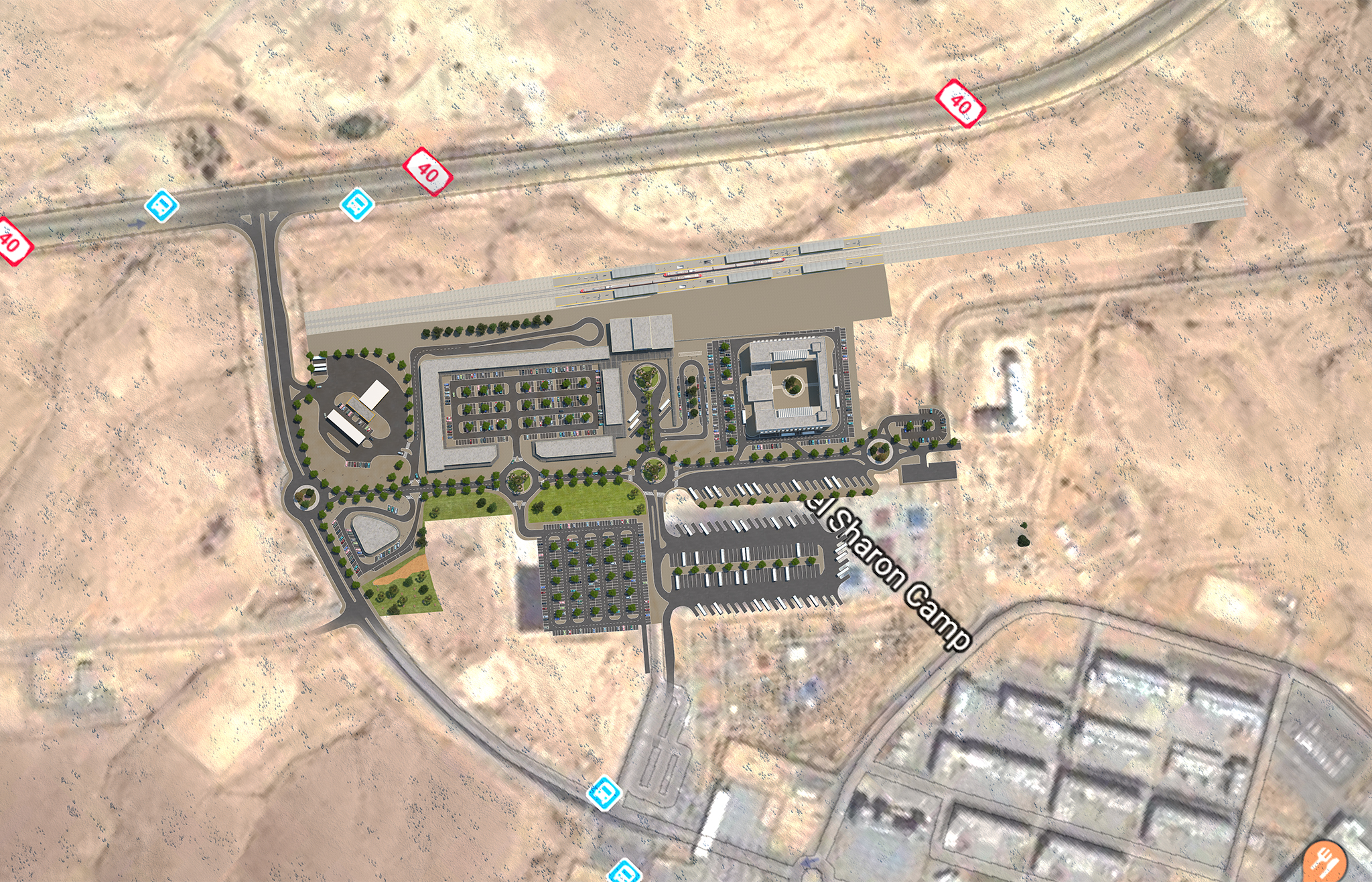 הקמת מרכז תחבורה בכניסה המערבית לעיר הבה"דים מכביש 40. התוכנית המוצעת כוללת מרכז תחבורה הכולל מסוף לאוטובוסים, מסוף kiss&ride, park&ride, חניון לרכב דו גלגלי הכל בצמוד למרכז הרכבתי ושני מוקדי מסחר ומתחם תחנת דלק ואזור למלונאות. מרכז התחבורה אמור לשפר את איכות החיים ורמת השירות לחיילים, משפחותיהם ואורחיהם, הנוסעים על כביש 40 ותושבי האזור. נוסף לכך, העתקת קווי מתח עליון קיימים מעל מרכז שירותי הדרך לתחום הכביש.